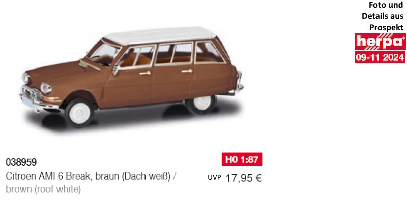 Das PKW-Sortiment bei Herpa erfreut sich immer großer Beliebtheit, weshalb immer wieder abverkaufte Modelle in neuer Farbe aufgelegt werden. Der Citroën Ami 6 Break wird erneut in das aktuelle Herpa-Programm aufgenommen und erscheint aktuell in den Farben Pastelltürkis und in Braun mit weißem Dach.