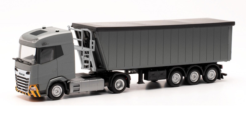 Die grau/gelbe-Baufahrzeugserie wird mit dieser Kombination, einer DAF XG Zugmaschine ohne Chassisverkleidung mit einem Stöffellinerauflieger, ergänzt.