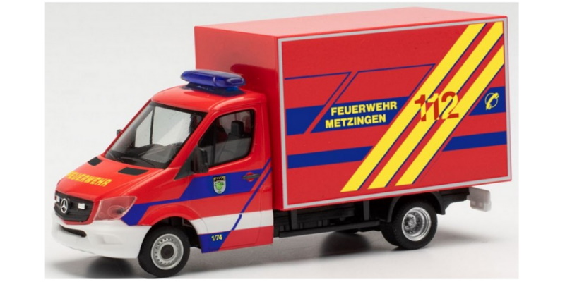 Als Gerätewagen Technik wird dieser Mercedes-Benz Sprinter mit Kofferaufbau bei der Feuerwehr in Metzingen in Baden-Württemberg eingesetzt. Die für die Fahrzeuge der Feuerwehr Metzingen typische Farbgebung der Fahrzeugbeschriftung macht auch das Herpa-Modell zu einem Schmuckstück für jeden Sammler.