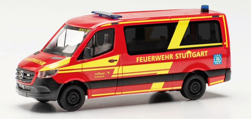 Die Branddirektion Stuttgart stellt inzwischen eine beachtliche Anzahl an Modellpaten. Mit diesem Mercedes-Benz Sprinter der aktuellen Baureihe wird der Einsatzleitwagen ELW 1-10 umgesetzt. Wie das Original trägt auch das Modell den blauen Aufkleber mit dem Hinweis der europaweit gültigen einheitlichen Notrufnummer 112.