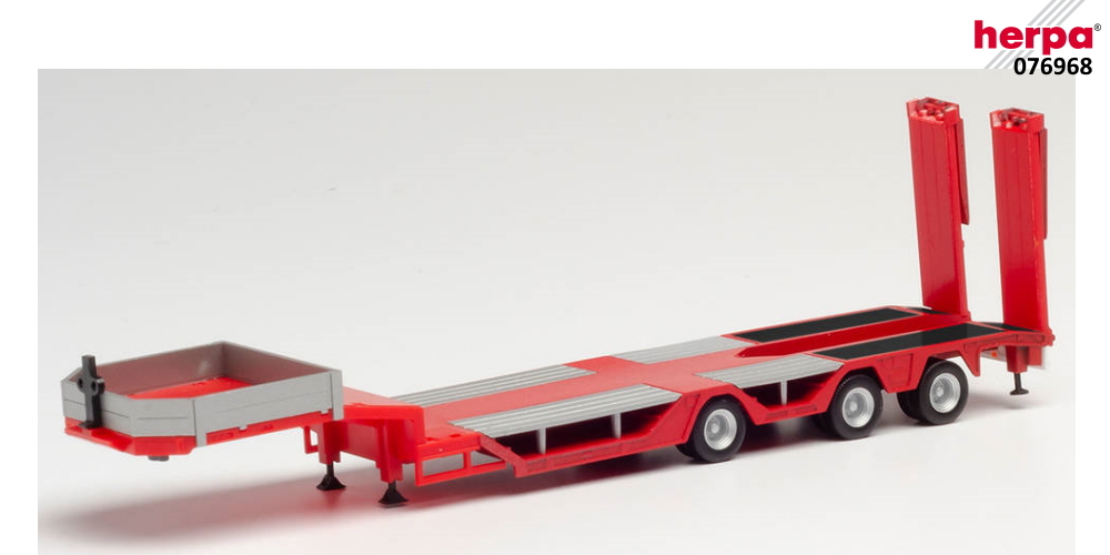 Der neue Goldhofer Allrounder, ein Semitiefladeauflieger mit Radmulden und heckseitigen Auffahrrampen, ergänzt bei Herpa das Sortiment der Soloauflieger zunächst in roter Farbgebung.
