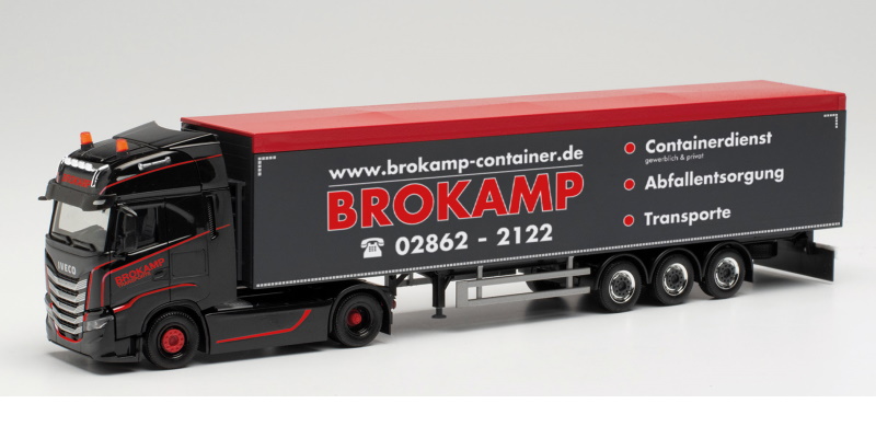 Im Westmünsterland ist das auf Abfallentsorgung und Containerdienste spezialisierte Unternehmen Brokamp ansässig. Neu im Fuhrpark sind diese bei dem Herpa-Modell umgesetzte Iveco S-Way Zugmaschine sowie auch der neu gestaltete Schubboden-Auflieger. Diese besondere Modellkombination wird von Herpa in limitierter Auflage produziert.