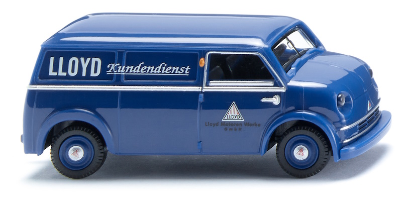 Dieser Transporter prägte die Borgward-Ära bis zum letzten Tag. WIKING stellt den Lloyd LT aus neuen Formen vor und ergänzt damit die Reihe Epoche prägender Fahrzeuge der Wirtschaftswunderjahre. So reiht sich der LT nahtlos in die Reihe von VW T1 und Ford FK 1000 ein. Der „große“ Lloyd wurde sowohl als Bus als auch als ausgemachter Transporter gebaut – anfangs noch mit Sperrholz beplankt, erst in der zweiten Hälfte der Fünfzigerjahre wurde am Bremer Produktionsort Stahlblech genutzt. Die Motorisierung des Vorbilds war in Produktionszeiten wahrlich bescheiden: Von 1952 bis 1955 verfügte der Lloyd LT 500 über einen Zweizylinder-Zweitaktmotor mit 386 cm³ Hubraum und einer Leistung von 13 PS, danach wurde der baugleiche Lloyd LT 600 mit einem Zweizylinder-Viertaktmotor mit 596 cm³ Hubraum und 19 PS ausgeliefert. Bis zum Borgward-Konkurs 1961 wurden 9.900 Lloyd LT 500 und 14.768 LT 600 gebaut. Borgwards Transporter ergänzt damit die nahezu komplette WIKING-Typenpalette des Nachkriegsjahrzehnts. Karosserie blau, Inneneinrichtung und Fahrgestell schwarz. Seitliche Bedruckung mit Lloyd-Logo auf den Türen und weißem Schriftzug Lloyd Kundendienst auf den Flanken. Scheinwerfer silber, Zierleisten silbern bedruckt. Heckseitig rot aufgedruckte Rückleuchten.