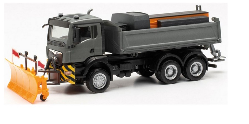 Die grau/gelbe-Baufahrzeugserie wird fortgesetzt und mit zwei weiteren Fahrzeugen erweitert. Als Nachzügler der Winterzeit erscheint der 3-achsige Allradkipper auf MAN-Fahrgestell, das Fahrerhaus neu mit den Individual-Applikationen. Parallel dazu ergänzt ein 4-achsieger Betonmischer auf Mercedes-Benz Arocs (der neuesten Generation bereits mit Spiegelkameras) den Fuhrpark. Die Serie setzt weiterhin auf die gelb/schwarze „Beklebung“ auf der Stoßstange, sowie den transparenten flachen LED-Rundumleuchten.