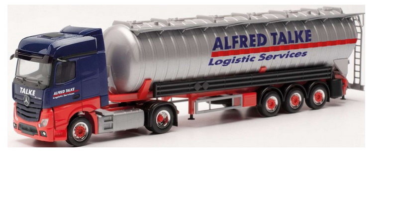 Ein Talke-Modell darf bei Herpa nach dem Erscheinen eines neuen Siloaufliegers nicht fehlen. Mit einer aktuellen Mercedes-Benz Actros BigSpace Zugmaschine mit Spiegelkameras wird der bei Herpa neue ADR Saugsilo-Auflieger im Design des Unternehmens aus Hürth gefertigt.
