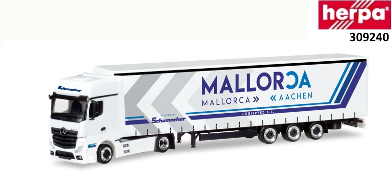 Die nicht nur durch die Herpa Showtrucks bekannte Spedition Schumacher aus Würselen bei Aachen hat mit der Logispeed SL, powered by Schumacher, ein Tochterunternehmen gegründet. Deren Sitz ist die beliebte Ferieninsel Mallorca, die künftig mit LKW der neuen Firma versorgt wird. Herpa Mercedes-Actros Lowliner-Zugmaschine mit Gardinenplanen-Auflieger in dem neuen Design.