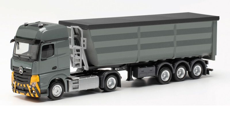 Der neues Stahlrundmuldenauflieger ist auch direkt in der grau/gelben-Baufahrzeugserie erhältlich. Ein neuer Mercedes-Benz Actros L mit Spiegelkameras kommt hier zum Einsatz.
