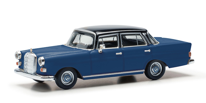 Die legendäre Heckflosse von Mercedes-Benz erscheint nun in Blau mit schwarz abgesetztem Dach. Das Modell auf Basis der 1965er Version ist mit vielen Details bedruckt. Der Mercedes-Stern an der Front ist als feines Fotoätzteil separat eingesetzt.