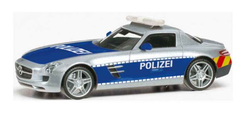 Für Messen und Ausstellungen wurde dieser in feinem graumetallic-lackierte Mercedes-Benz SLS für als Polizei-Showcar gestaltet. Herpa-Modell in einmaliger Auflage.