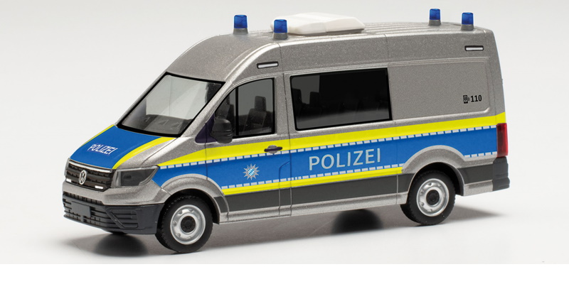 Als so genannter Halbbus erscheint bei Herpa der vorbildgerecht mit drei Rundumleuchten und einer Klimaanlage ausgestattete VW Crafter der Polizei in Straubing.