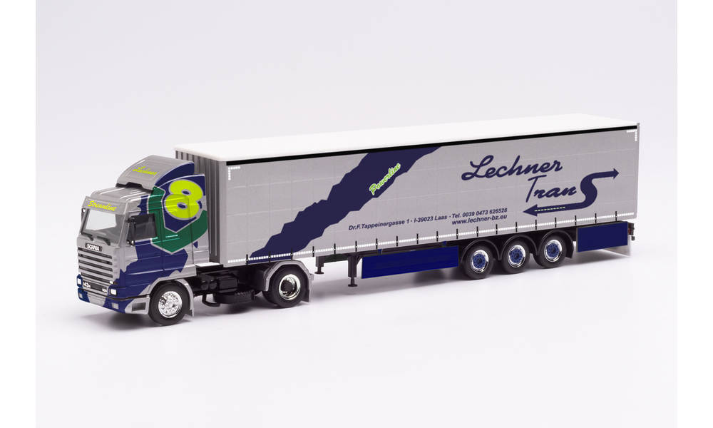 Dennis Lechner hat sich einen Traum erfüllt und einen klassischen Scania 143 420 Streamline restauriert und im Design seiner aktuellen Fahrzeuge gestaltet. Das eindrucksvolle Fahrzeug, heute kaum noch auf den Straßen anzutreffen, wird von Herpa mit einem passenden Gardinenplanen-Auflieger in einmaliger Auflage umgesetzt.
