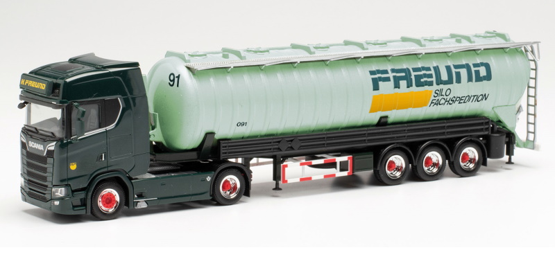 Seit über 25 Jahren werden von Herpa Miniaturmodelle nach Vorbild der Spedition Freund gefertigt, so wird auch der bei Herpa neue Saugsilo-Auflieger im Design der Spedition Freund als Formneuheit gefertigt. Gezogen von einer aktuellen Scania CS Zugmaschine wird dieser neue Silosattelzug in einmaliger Auflage gefertigt.