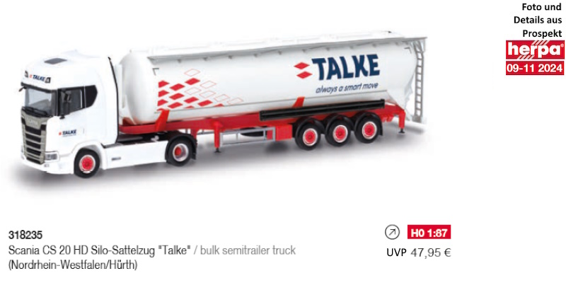 Die neue Gestaltung der Fahrzeuge der Spedition Talke hat bereits auf den Silozügen des Unternehmens Einzug gehalten. Auch der aktuelle Scania CS ist im Fuhrpark vertreten und dient als Vorbild für ein attraktives Miniaturmodell von Herpa.