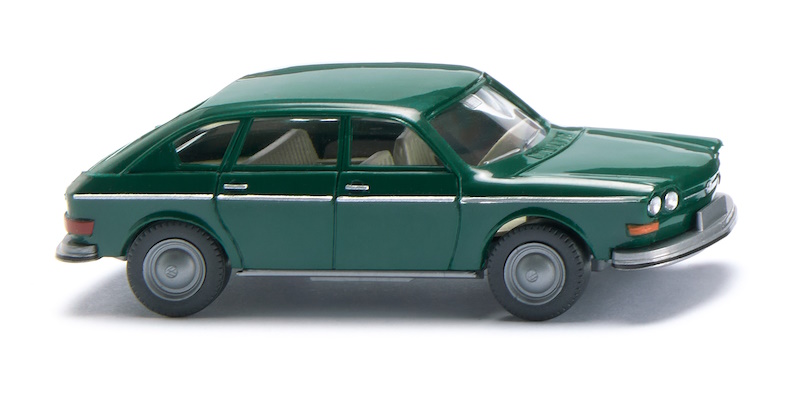 Die Autofreunde in Deutschland wussten das Ungewöhnliche im Autobau schon immer beim Namen zu nennen. So wurde der heckgetriebene VW 411 wegen seines langen nach vorn ragenden Kofferraums kurzerhand „Nasenbär“ genannt. Alles natürlich mit einem Augenzwinkern, denn die Fließhecklimousine war für all jene gedacht, die sich vom Käfer-Besitzer hochgearbeitet hatten. Sie brachte für Wolfsburger Verhältnisse mächtig Fahrzeugvolumen auf die Straße. Karosserie moosgrün, Inneneinrichtung kieselgrau. Fahrgestell und Felgen silber. Frontscheinwerfer per Hand gesilbert, Blinker orange. Rückleuchten rot bedruckt. VW-Logo und Zierstreifen vorn silbern bedruckt. Seitliche Zierleisten und Türgriffe in silber.