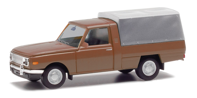 In seiner ersten Bauform, noch mit Chromstoßstangen sowie verchromtem Kühlergrill, kehrt der Wartburg Trans in braun und einer aufgesetzten Plane zurück.