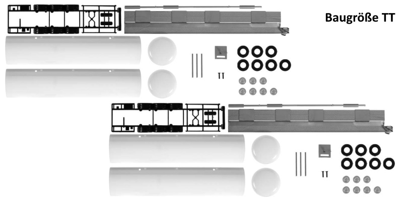 Jeweils zwei komplette Zugmaschinen oder zwei komplette Auflieger sind unmontiert im Set enthalten und können nach eigenen Wünschen lackiert und mittels Herpa Steckbauweise ohne Klebstoff selber montiert werden.