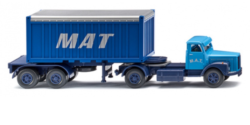 In den skandinavischen Containerhäfen, aber auch in Deutschland war der Scania L111 vor vier Jahrzehnten täglich anzutreffen. Die Haubenzugmaschine sorgte für eine verlässliche Containerlogistik auch in den Farben des Containertransporteurs „M.A.T.“. WIKING miniaturisiert zur Modellpremiere den Scania-Hauber im Corporate-Design von „M.A.T.“ und lässt den Sattelzug mit Open-Top-Container vorfahren. Das Gespann steht für das große Involvement der Traditionsmodellbauer, gerade wenn es um den schwedischen Markt geht. Auch dort wird der Scania L111 viele neue Freunde gewinnen. Zugmaschinenfahrerhaus mit Sonnenblende lichtblau. Fahrgestell mit Kardanteil und Felgen saphirblau. Inneneinrichtung graublau. Kühlergrill saphirblau bedruckt. Auf dem Kühlergrill rot-silbernes Scania-Logo. An den Seiten Typenzeichen Scania 111 sowie Scania-Schriftzug und Türgriffe silbern bedruckt. Zusätzlich silberner Schriftzug „M.A.T.“. Fahrgestell mit orangenen Blinkern, gesilbertem Riffelblech und heckseitig roten Rückleuchten. Auflieger mit Fahrgestell, Doppelkotflügel und Felgen saphirblau. Fahrgestell heckseitig mit silbernem „M.A.T.“-Schriftzug. Heckleuchten rot bedruckt. Enzianblauer Open-Top-Container mit silbernem Dach und seitlich silberner „M.A.T.“-Bedruckung.