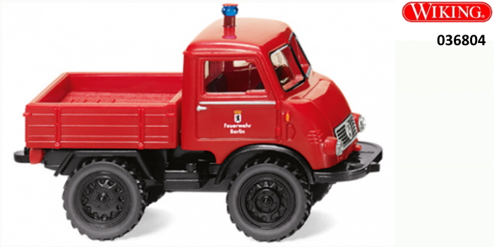 Er war viele Jahre lang der „Hofhund“ der Berliner Feuerwehr. Wenn es um Gespannfahrten in Wachennähe ging, konnten sich die Wehrmänner kurzerhand aufschwingen, um in der geschlossenen Westfalia-Kabine ins Lenkrad zu greifen. Die Traditionsmodellbauer, die seit jeher ihre Vorbilder bei der Berliner Feuerwehr gesucht und gefunden haben, können jetzt den jüngsten Unimog-Zugang im Programm in den hoheitlichen Dienst stellen. Fahrgestell mit Anhängerkupplung sowie Kardanteil, hinteren Kotflügeln und Felgen schwarz. Kabine sowie Pritsche und Pritscheneinlage rot. Auer-Blaulicht blau transparent eingesetzt und rot koloriert. Schwarze Stoßstange vorne sowie schwarzer Kühlergrill mit silbernem Mercedes-Benz-Stern. Inneneinrichtung mit Lenkrad schwarz. Vordere Scheinwerferringe silbern, Fensterrahmen schwarz bedruckt. Zierleiste und Türgriffe an den Seiten gesilbert. Blinker orange. Auf den Türen Wappen und Schriftzug der Berliner Feuerwehr. Scheinwerfermulden vorne silbern ausgemalt.