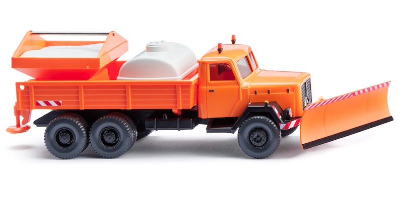 Ulmer Eckhauber heulte sich verlässlich durch den Winter Luftgekühlter Heuler – im Dienst unüberhörbar. Und auch im Winter zeigte sich der Ulmer Eckhauber von seiner besten Seite und machte nie schlapp. Ganz im Gegenteil! Nach historischen Fotovorlagen miniaturisierte WIKING das lange Jahre verlässliche Einsatzfahrzeug, das damit erstmals in 1:87 im Winterdienst zu sehen ist. Noch viele Jahre nach dem Auslaufen der vorletzten Eckhauber-Generation nutzten Winterdienste den Vorbild-Magirus. Fahrerhaus mit Pritsche pastellorange. Signallicht orangetransparent ins Stangenwarnlicht eingesetzt. Fahrgestell mit Kardanteil schwarz. Pritschentank grauweiß. Streugutbehälter mit Bodenplatte, Streuer sowie Räumschild und Halterung pastellorange. Streuguteinsatz grauweiß. Felgen schwarz, Kühlergrill mit schwarzer Grillfläche sowie silbernem Deutz-Logo. Fahrerhausseiten mit schwarzen Türgriffen und ebenfalls schwarze Schnallengravuren an der Motorhaube. Stoßstange, seitliche Pritsche und Räumschild mit rotweißen Warnschraffuren. Frontscheinwerfer gesilbert, Rückleuchten rot bedruckt. Streugutbehälter mit Schriftzug „Winterdienst“ sowie rotweißer Warnschraffur.