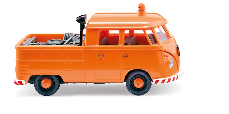 Es war der VW T1, der den Wiederaufbau und die Erweiterung des deutschen Straßennetzes begleitete. Damals wurden die Dokas reihenweise für die Fuhrparks der Bauhöfe von Städten, Kreisen und Autobahnen beschafft. Natürlich im warnenden Pastellorange lackiert und mit Warnschraffur an den Stoßstangen aufgewertet rückten sie dann aus – die Pritsche immer mit Geräten für den nächsten Einsatz beladen. Gerade die zweigeteilte Fahrzeugoptik von Kabine und kurzer Pritsche macht die Doka noch heute so unverwechselbar. Für die Bauhofmitarbeiter war die Doppelkabine zugleich ein willkommener Pausenraum, bei Wind und Wetter versteht sich. WIKING miniaturisiert den Transporter nach Originalvorbildern. Karosserie mit Doppelkabine und Pritsche kommunalorange. Warnlicht orangetransparent in mittigen Sockel eingesteckt. Frontscheinwerferlinsen transparent eingesteckt, Rückleuchten rottransparent eingefügt. Inneneinrichtung graublau, Fahrgestell und Lenkrad schwarzgrau. Stoßstangen vorne und hinten weiß mit rot bedruckter Warnschraffur eingesteckt, Felgen schwarz mit pastellorangener Radkappe. Frontseitiges VW-Logo schwarz bedruckt, Blinkerflächen rotorange. Scheinwerfergläser silbern hinterdruckt. Seitliche Türgriffe schwarz silbern bedruckt. Geräteeinsatz graublau mit schwarzem Suchscheinwerfer auf der Pritsche eingefügt.