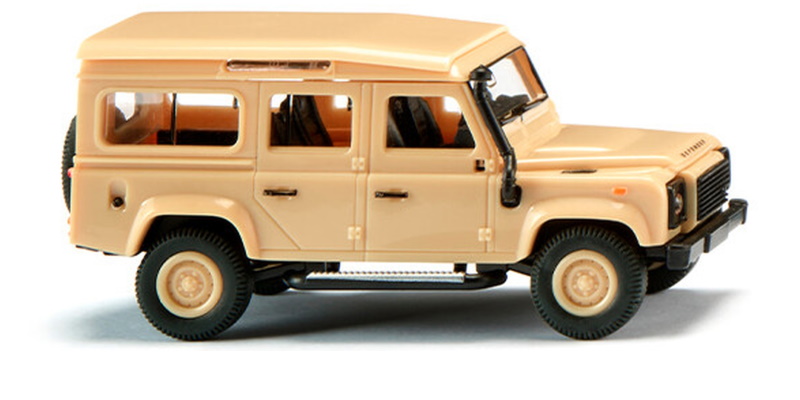 Es ist der mächtige Schnorchel, der an die Expeditionsabenteuer der frühen Land Rover-Generationen anknüpft. WIKING miniaturisiert die jüngste Generation des Land Rover Defender 110 im aktuellen Auftritt – der mächtig aufragende Luftansauger auf der Beifahrerseite gehört natürlich dazu. Der britische Off-Roader mit legendärer Historie wird detailreich ausgearbeitet, so dass das Tropendach als separates Teil aufgesetzt ist. WIKING wählt die fünftürige Karosserie, die dem Defender in der 87-fachen Miniaturisierung zu einem imposanten Allrad-Klassiker verhilft. Karosserie, Tropendach und Felgen beige. Fahrgestell mit Luftansauger, Rückspiegel, aber auch Basisrahmen und Inneneinrichtung mit Armaturenbrett schwarz. Frontseitiger Defender-Schriftzug in dunkelgrau, Fensterrahmen und Kühlergrill sowie Türgriffe und Tankdeckel schwarz bedruckt. Seitlicher Blinker orange, heckseitig rote Rücklichter, Blinker orange sowie Rückfahrlicht silbern bedruckt. Land Rover-Logo grün-gold bedruckt, Defender-Schriftzug dunkelgrau.