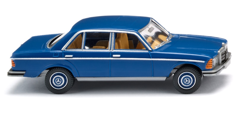 Karosserie enzianblau, Fahrgestell silber. Inneneinrichtung mit integriertem Lenkrad und langer Ablage beige. Karosseriegestaltung mit Zierleisten veredelt, heckseitig silberner Mercedes-Benz-Stern und Typenzeichen „240 D“. Vordere Blinker und Rücklichter per Hand bemalt.