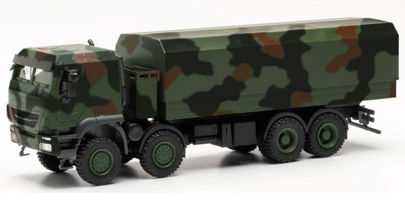 Die geschützt Version des Iveco Trakker wächst in Form eines neuen 8x8 Fahrgestells für das extra auch neue Pritsche/Plane-Aufbauten umgesetzt werden. Vorbildgerecht und angelehnt an die alten Rundplanen hat diese neue Plane auch mehr Flächen, wie nur eine Normalplane. Die neutrale Version erscheint unter der Art.Nr. 746915, das Flecktarndesign ist unter der Art.Nr. 746922 erhältlich.