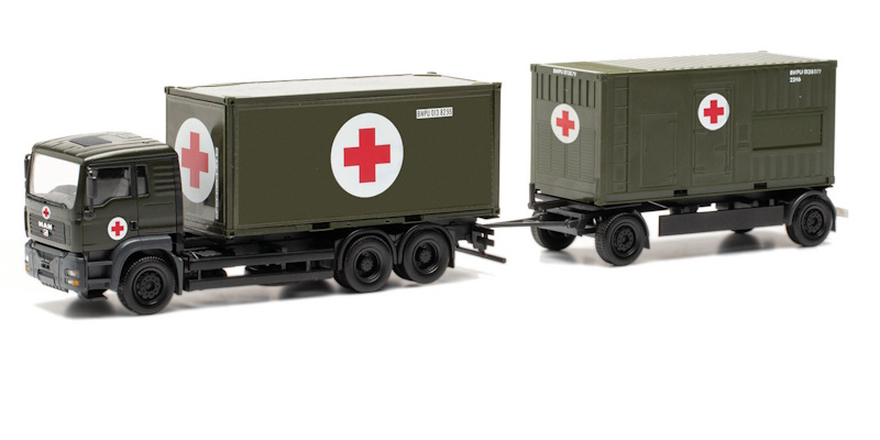 Der Military-Bereich ist diesmal auf den SAN-Bereich ausgelegt. Dieser MAN TGA L Hängerzug ist mit einem „normalen“ SAN-Container und einem Stromgenerator beladen. Beides ist in der Regel für den Einsatz eines Feldlazarett von Nöten.