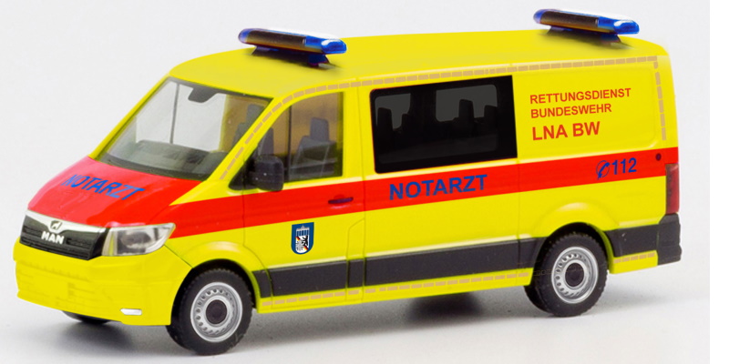 Dem leitenden Notarzt des Bundeswehrkrankenhaus in Berlin steht dieser mit entsprechender Beschriftung versehene MAN TGE Flachdach zur Verfügung, der von Herpa mit zwei Warnlichtbalken bestückt umgesetzt wurde.