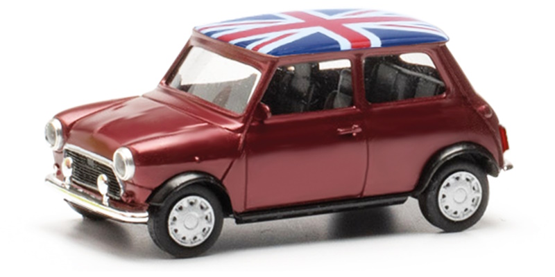 Nur ein Rechtslenker ist bei Herpa im Sortiment. Selbstverständlich muss es hier ein Mini mit britischem Understatement sein. Dieser Mayfair mit zweiteiligem Grill, sowie zwei Zusatzscheinwerfern auf der Stoßstange erscheint in noghtfire red metallic und dem Union Jack auf dem Dach.