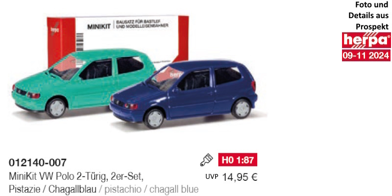 MiniKits sind original Herpa Modelle als Bausätze für Bastler und Modelleisenbahner. MiniKits lassen sich aufgrund der Herpa Schnappbauweise mit wenigen Handgriffen ohne Kleber zusammenbauen (Montageanleitung liegt bei). So kann die Modellanlage preiswert mit Autos bestückt oder ein Autotransportzug günstig mit PKW beladen werden.