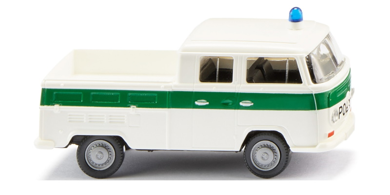 Die Polizei hegte und pflegte die VW Doka auf dem Hof der Bereitschaftspolizei für ihre speziellen Einsätze. Auch der T2 mit seiner Doppelkabine verfügte über die hellgrüne Bauchbinde. Der VW T2 in seiner Pritschenversion ist bei WIKING ein wirklicher Transporterklassiker, der bereits das Programm der siebziger Jahre prägte. Dass er sich gerade in der jüngsten Vergangenheit großer Beliebtheit erfreut, veranlasste die WIKING-Macher, der angestammten Pritschenversion die authentische Doppelkabine aus neuen Formen zur Seite zu stellen. Karosserie weiß, Fahrgestell und Inneneinrichtung mit Lenkrad schwarz. Rücklichter rottransparent, Frontscheinwerfer transparent eingesetzt. Stoßstangen vorne und heckseitig weiß eingesteckt. Frontseitig VW-Logo weiß, Blinkerflächen orange gehalten. Scheinwerfereinfassung in Aluminium-Optik. Seitliche Türgriffe silbern gehalten. Umlaufend hellgrüne „Bauchbinde“ mit Polizei-Schriftzug front- und heckseitig.