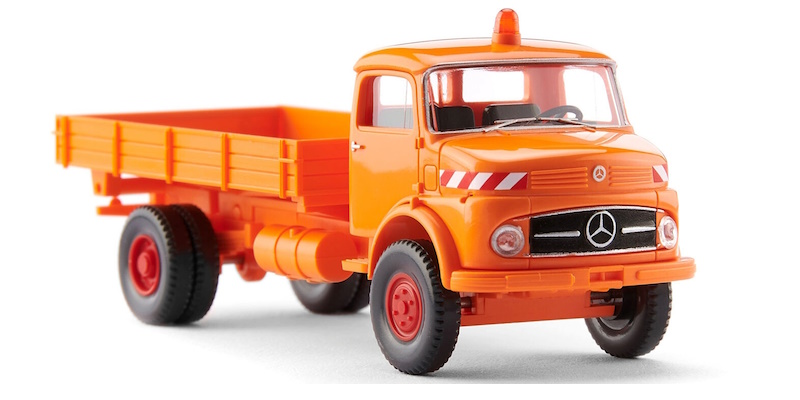 Der Kurzhauber-Kipper der Straßenwärter Die Straßenwärter der Sechzigerjahre wussten, dass auf ihn bei Wind und Wetter Verlass war. Dieser Mercedes-Benz LAK 710 Pritschenkipper spiegelt in 1:87 die einstige Wirklichkeit in den Bauhöfen von Städten und Straßenbauämtern wider. Die Verantwortlichen wünschten von ihren Einsatzfahrzeugen ein Höchstmaß an Flexibilität. Auf der Basis eines wendigen Lkw sollte die Pritsche kippbar und überall leicht beladbar sein. WIKING miniaturisiert den traditionsreichen Kurzhauber von Mercedes-Benz mit zahlreichen Details und versorgt ihn überdies mit dem gefälligen Zierrat, die die Mercedes-Benz-Hauber in jenen Jahren so charakteristisch machten. Hinzu kommt, dass der aufstellbare Kipper den Kurzhauber zu einem echten Baustellenklassiker macht. So kannte man den kompakten und ebenso wendigen Kipper in den kommunalen Bauhöfen und Straßenmeistereien. Natürlich sind die Frontscheinwerfer transparent eingesetzt. Bei Mercedes-Benz in Mannheim waren damals die 7,5-Tonner und 14-Tonner für den Verteilerverkehr und den Baustelleneinsatz vom Band gelaufen. Fahrgestell mit Kardanteil, Tankabdeckung in pastellorange, ebenso Adapterrahmen und Hydraulikzylinder für den Kipper. Fahrerhaus sowie Kühlergrill und Trittstufen sowie heckseitige Klappe ebenfalls in pastellorange. Felgen rot, Inneneinrichtung mit Lenkrad schwarz. Pritscheneinkleber in silber. Spiegel und Peilstangen in schwarz beigelegt. Seitliche silberne Türgriffe. Kühlergrillfläche in schwarz, Rahmen und mittige Zierleiste sowie Mercedes-Benz-Stern gesilbert. Scheinwerfer transparent eingesetzt. Vorne rotweiße Warnschraffur. Rückleuchten rot.