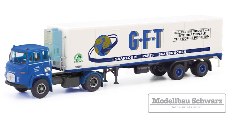 FORMNEUHEIT! Passend zu den sehr detaillierten Zugmaschinen des Typ Mercedes-Benz LPS 2032 und der Scania Vabis LB76, erscheinen nun auch die ersten Auflieger in verschiedenen Ausführungen. Ob Rippenstruktur oder glatt, ob als „normaler“ Koffer oder mit Kühlaggregat, ganz gleich… Viele Kombinationen lassen sich hier abbilden. Auch das Fahrgestell ist detailreich, mit vielen Kombinationsmöglichkeiten (Pendelachse oder starr, Anbauteile können in der Anordnung variieren) ausgestattet. Die ersten vier Modelle mit diesem Koffer erscheinen in der bekannten schwarzen Faltschachtel, in limitierter Auflage. Die Scania Vabis LB 76 der Wetzlarer Spedition J.J. Völk zieht einen Kühlkofferauflieger im mit Beschriftung von GFT (Gesellschaft für Transport m.b.H.).der Spedition.