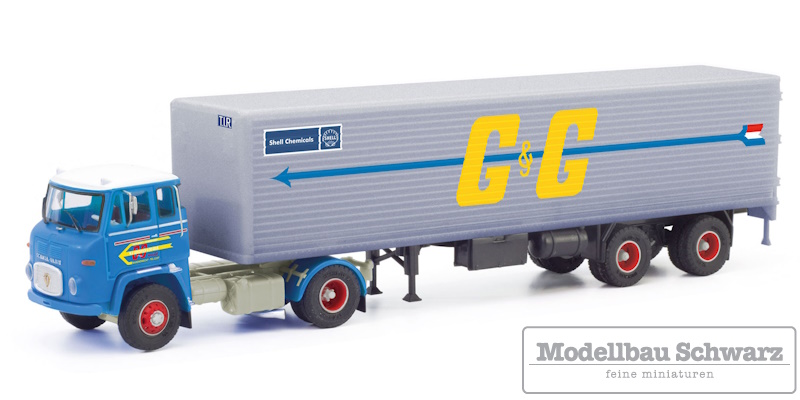 Passend zu den sehr detaillierten Zugmaschinen des Typ Mercedes-Benz LPS 2032 und der Scania Vabis LB76, erscheinen nun auch die ersten Auflieger von Modellbau Schwarz in verschiedenen Ausführungen. Ob Rippenstruktur oder glatt, ob als „normaler“ Koffer oder mit Kühlaggregat, ganz gleich… Viele Kombinationen lassen sich hier abbilden. Auch das Fahrgestell ist detailreich, mit vielen Kombinationsmöglichkeiten (Pendelachse oder starr, Anbauteile können in der Anordnung variieren) ausgestattet. Die ersten vier Modelle mit diesem Koffer erscheinen in der bekannten schwarzen Faltschachtel, in limitierter Auflage. Goedkoop & De Geus aus dem niederländischen Barendrecht ist einer der vier Paten, die Scania Vabis LB 76 zieht einen Kofferauflieger im damaligen Kleid der Spedition.