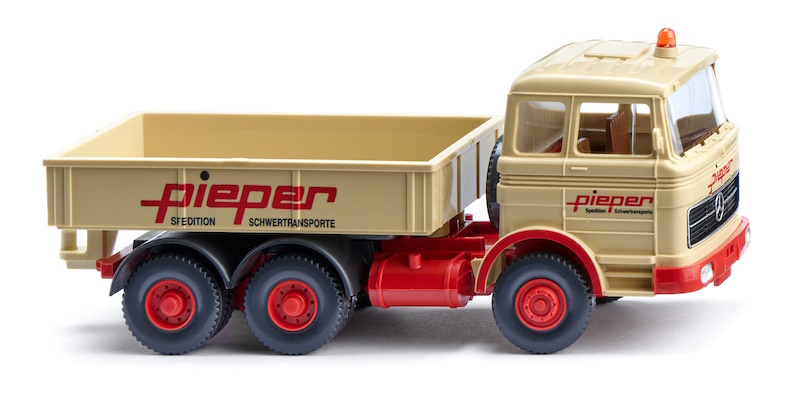 Pieper-Schwerlastzugmaschine für Ruhrgebietsaufgaben Mercedes-Benz war für die Schwertransport-Spedition Pieper eine der ersten Adressen, wenn es um Spezialfahrzeuge für den täglichen Spezialeinsatz ging. Erste Wahl dabei war der Mercedes-Benz mit dem typischen kubischen Fahrerhaus und der Ballastpritsche. Pieper besitzt eine lange Speditionstradition, wurde das Unternehmen schon 1901 in Dortmund gegründet. Bis in die Fünfzigerjahre hinein wuchs Pieper mit den Aufgaben, die der Wiederaufbau der Spedition abverlangte. So wurde das Unternehmen eines der ganz Großen der Branche. Fahrerhaus mit Warnlichtsockel sowie Ballastpritsche grünbeige, Inneneinrichtung olivbraun. Fahrgestell mit Kardanwelle, Felgen und Stoßstangenelement feuerrot. Doppelkotflügel schwarzgrau. Schwarzer Kühlergrill mit gesilbertem Rahmen, Zierleiste und Mercedes-Benz-Stern in silber. Fahrerhausbedruckung vorn mit rotem Pieper-Schriftzug. Seitliche Türbedruckung mit rotem Pieper und schwarzem Schriftzug Spedition und Schwertransporte auf den Fahrerhaus- und Pritschenseiten.