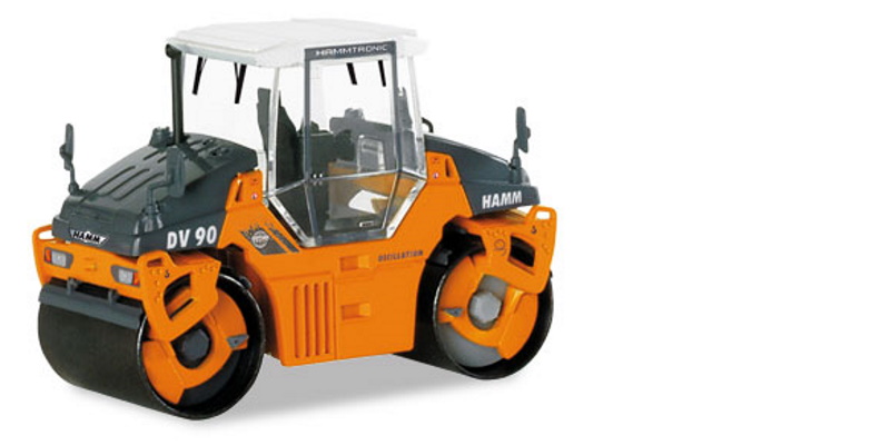 Zu den wenigen deutschen Herstellern von Straßenwalzen gehört die Firma Hamm aus Tirschenreuth. Die Doppel-Vibrationswalze DV 90 gehört zum aktuellen Typenprogramm und ist das Vorbild für die neue Herpa-Baumaschine. Das Modell zeichnet sich durch die vielen Details aus. So sind die Walzen drehbar gelagert und aus brüniertem Metall. Selbst der so genannte „Hundegang“ kann nachgeahmt werden. Die Kabine ist mit einer Inneneinrichtung ausgestattet, seitenverschiebbar gelagert und mit vier Rückspiegeln bestückt.