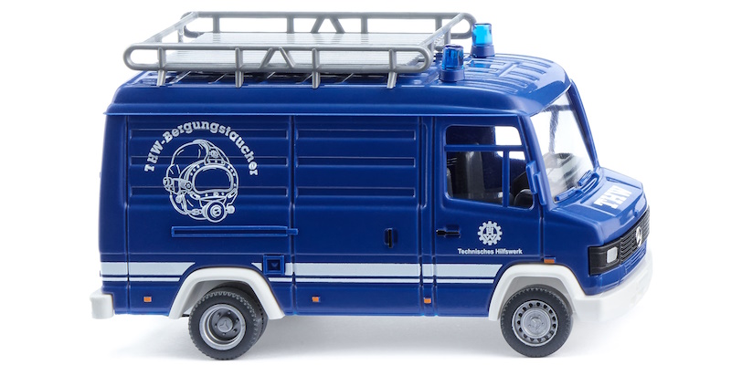 Einsatz für die THW-Bergungstaucher Das Technische Hilfswerk hatte die zweite, komplett neu entwickelte Generation des T2 von Mercedes-Benz von Beginn an beschafft, um zwischen 1986 und 1996 eine Ablösung für die bei den Hilfsorganisationen beliebte Vorgängerbaureihe zu haben. Dementsprechend wurde der alltagstaugliche Mercedes-Benz-Transporter für vielfältige Aufgaben eingesetzt. 1991/92 war die Fertigung des T2 aus Düsseldorfer Produktion ins Werk Ludwigsfelde verlagert worden. WIKING miniaturisiert das Vorbild des für Bergungstaucher eingesetzten 507 D. Fahrgestell weiß, Kühlergrill schwarz, Karosserie ultramarinblau. Inneneinrichtung anthrazitgrau. Felgen und Dachgepäckträger silber. THW-Schriftzug auf der Motorhaube. Seitliche THW-Streifen sowie -Schriftzüge, aber auch weißes Bergungstaucher-Logo. Türgriffe schwarz. Blautransparent eingesetzte Warnlichter, Scheinwerfer und Mercedes-Benz-Stern vorn gesilbert. Blinker orange bedruckt.