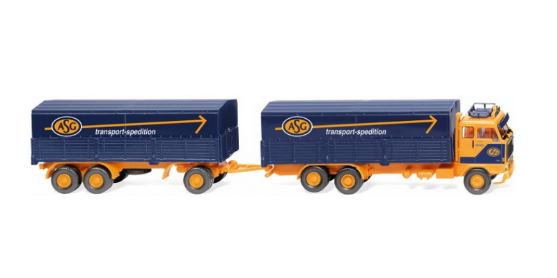 Imposanter Schweden-Express rollt als Hängerzug ins Programm Die neuen Formen machen es möglich – der Volvo F89 wird zum mächtigen Schweden-Express! WIKING miniaturisierte ein völlig neues Fahrgestell, so dass das beliebte Youngtimer-Fahrerhaus jetzt auch als Hängerzug zum Einsatz kommt. Und natürlich gibt es keinen besseren Auftakt als die Gestaltung in den beliebten ASG-Farben. Über 40 Jahre nachdem sich WIKING erstmals der schwedischen Spedition ASG widmete, fährt damit ein weiterer Youngtimer in klassischen Farben ins Sortiment. Gerade in den letzten Jahren ist der WIKING-Fuhrpark nach den Vorbildern des schwedischen Logistikers immer weiter gewachsen. Attraktive Modelle – vom Container-Auflieger bis zum Kleintransporter – spiegeln inzwischen die Vielfalt des einstigen Spediteur-Allrounders wieder. Mit dem Volvo F89 und dem Fahrgestell aus neuen Formen kann endlich jenes Vorbild miniaturisiert werden, das einst den ASG-Fuhrpark genauso prägte wie den 1975 von WIKING vorgestellten Scania-Hängerzug. Besonders charakterprägend am Volvo F89 und typisch schwedisch: das Dachschild an der Stirn! Die „Aktiebolaget Svenska Godsbilcentraler“ war schon 1935 durch die Stockholmer Rederi AB Svea gegründet worden. Nachdem 1993 eine Kooperation mit Danzas vereinbart worden war, wurde ASG 1999 von dem Schweizer Unternehmen Danzas übernommen, das heute zur Deutschen Post AG gehört. Fahrerhaus mit Dachschild sowie vorderer Stoßstange mit Luftfilter und Fahrgestell mit Anhängerkupplung, aber auch hintere Doppelkotflügel me-lonengelb. Kühlergrill schwarz mit silbernem Volvo-Logo. Leiter, Dachträger sowie Hochbordpritsche und Verdeck saphirblau. „ASG“-Markengestaltung auf den Planenflanken. Seitlicher Blinker bedruckt, Türgriff, Typenschild „F89“ und „Volvo“-Schriftzug sowie silberne Haltestange. Türen mit melonengelbem ASG-Logo. Verglasung mit schwarzem Mittel- und Seitensteg. Melonengelbes Dachschild „ASG“ saphirblau bedruckt. Anhänger mit melonengelben Fahrgestell und Drehschemel sowie Schwingachse, aber auch Deichsel und Felgen melonengelb. Saphirblaue Hochbordpritsche und Verdeck sowie silbergrauer Einlegeboden. „ASG“-Markengestaltung auf den Planenseiten. Heckseitige Rücklichter karminrot bedruckt.