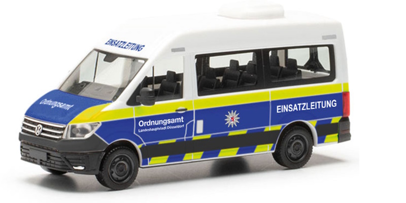 Das Design des Ordnungsamt Düsseldorf ist an die Polizeifahrzeuge in Nordrhein-Westfalen angelehnt. Nach dem VW T6 (094764) im Jahr 2019 und dem VW Passat Variant (095228) im Folgejahr erscheint nun dieser brandneue VW Crafter Bus in der Hochdachausführung, der als Einsatzleitwagen beschriftet ist. Das Modell wird vorbildgerecht ohne Signaleinrichtung in limitierter Auflage produziert.