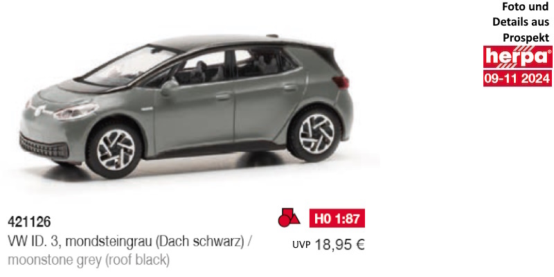 Der VW ID3 von Volkswagen steht bei Herpa in den Startlöchern und wird bei den Unifarben zunächst in Mondsteingrau mit schwarzem Dach zur Auslieferung kommen.
