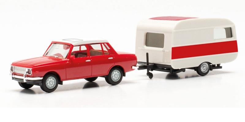 Urlaubzeit ist Reisezeit. In passend abgestimmtem Farbwechsel erscheint der Wartburg 353 82 mit einem passend gestaltetem Qek Junior Wohnwagen. Der Wartburg erhält ein drucktechnisch dargestelltes Dachfenster, sowie den Zusatzdruck "de Luxe".