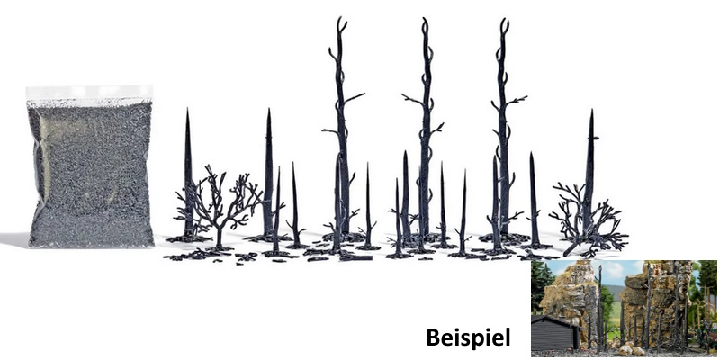 50 mm, verbranntes Geäst sowie Streumaterial für verbrannten Waldboden. Bausatz.