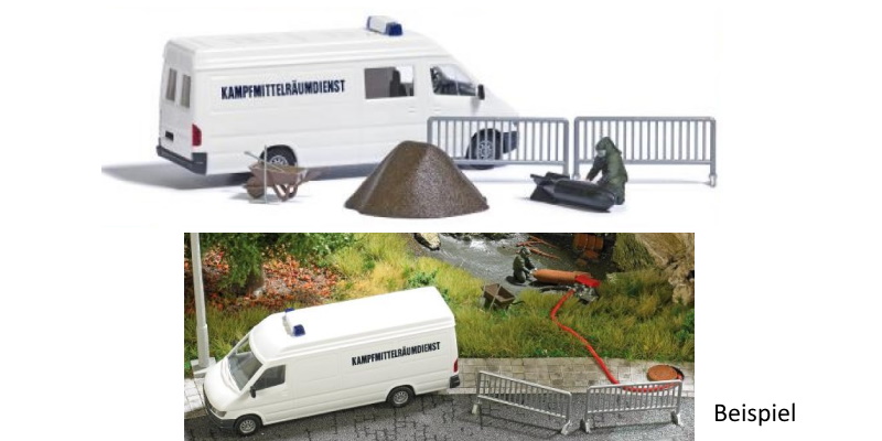 A bomb disposal team at work! With technician in protective suit, wheelbarrow, tools, sand pile, barriers and unexploded aircraft bomb as well as Mercedes-Benz Sprinter service vehicle.