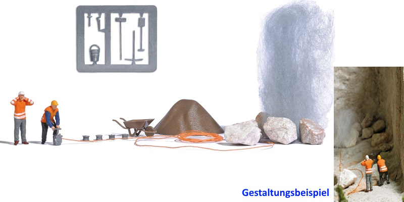 Sprengmeister, der mit einer Zündmaschine eine Sprengung auslöst und Mitabeiter, der sich dabei die Ohren zuhält. Mit Werkzeugen, Schubkarren, Felsbrocken, Seilen, Rauchschwaden und Sandhaufen.