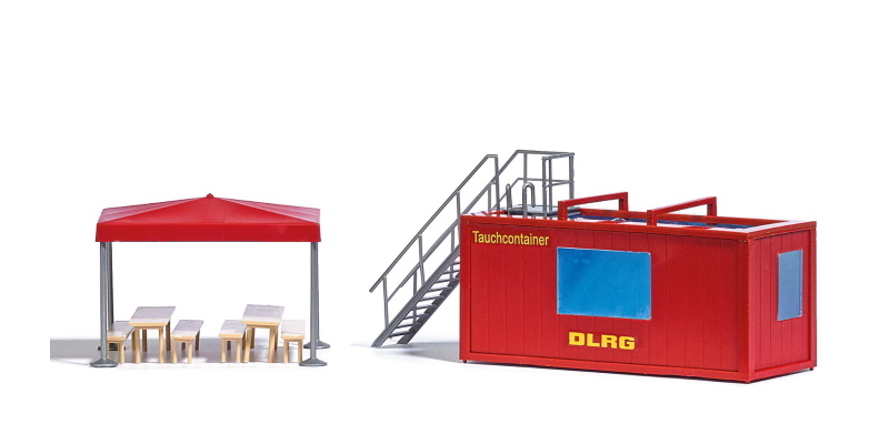 Vorbildgerecht mit Metalltreppe und passendem Zubehör wie Zeltpavillon und Brauereigarnituren. Realistische Nachbildung der Wasseroberfläche.