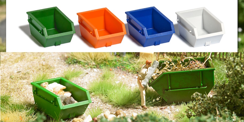 4 Absetzcontainer 1,5 m³ in verschiedenen Farben: Blau, Orange, Weiß und Grün.