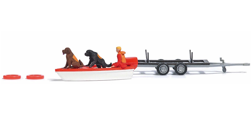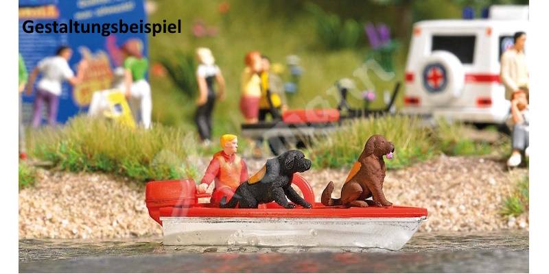 Set mit 2 Neufundländer-Hunden, davon einer sitzend, männlicher Einsatzkraft, Rettungsringen und Motorboot mit Anhänger.