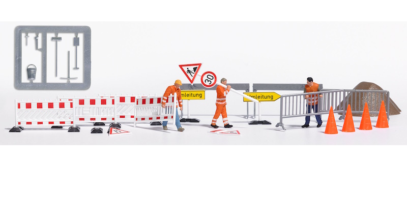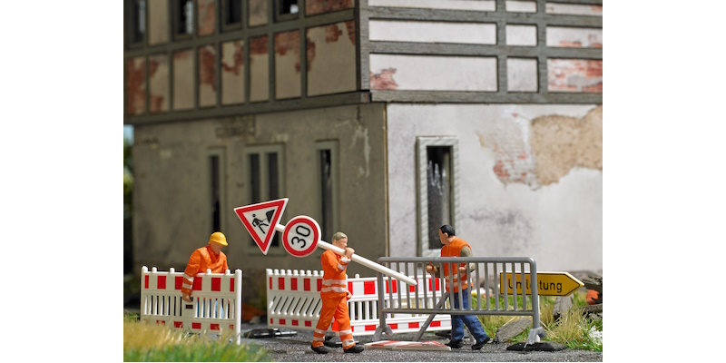 3 Straßenbauarbeiter in Arbeitskleidung der Epoche V. Mit verschiedenen Absperrungen,