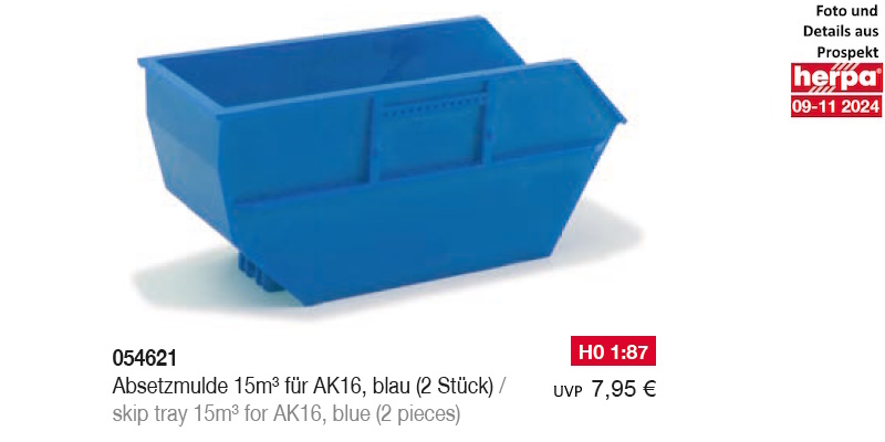 Besonders zur Ausschmückung von Dioramen sowie als Ladegut für entsprechende LKW werden die neuen Absetzmulden in der größeren Bauform in Blau als Set mit zwei Stück angeboten.